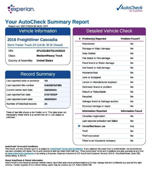 2016 Freightliner Cascadia Sleeper T/A Road Tractor, VIN: 1FUJGLBG7GLHG5122, Miles Showing: 836,842, Cummins ISX Diesel Engine, Transmission, AC/Heat Controls, Dual AM/FM Radio, Connex CB Radio, Bunk Beds, Microwave, Wet Line, 5th Wheel Slide, DEF Intake, GVWR: 52,000 lb, Known Condition: Starts, Runs, Moves, Per Seller: Kill Switch Needs to be Used to Prevent Battery Drainage (17454)