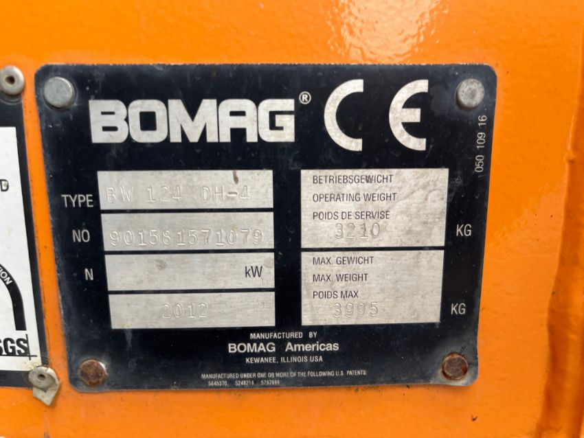 2012 Bomag BW124D-4 47" Smooth Drum Roller, SN: 90151571079, Hours Showing: 855, Duetz Diesel Engine, Open ROPS, Max Weight 2812 lb, Known Condition: Starts, Runs, Moves (17042)