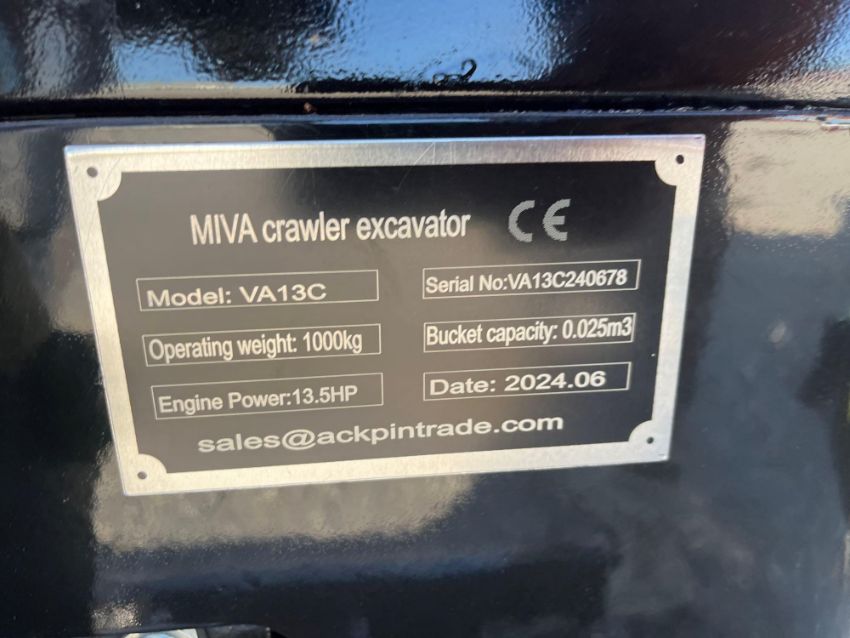 2024 MIVA VA13C Mini Excavator, SN VA13C240678, Rubber Tracks, 16" Digging Bucket, Dozer Blade, Manual Thumb, Known Condition: New *Due to this unit being shipped internationally with ethanol-based fuel in the tank, it may or may not have starting and running issues* (17320)