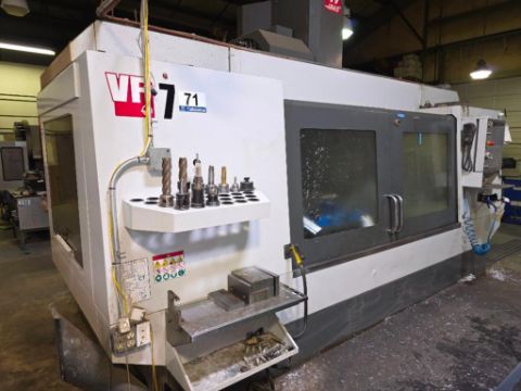 See Build Sheet Photo from Haas, Sn: 1129054, 84 in x 32 in x 30 in, 10K Inline Spindle, 30HP, 40T, 24+1 Tool Changer, 220v/60/3PH, Includes one Kurt Machine Vise, Condition: Operational - See Video, Note: Buyer Electrical Disconnect Fee - $150.00